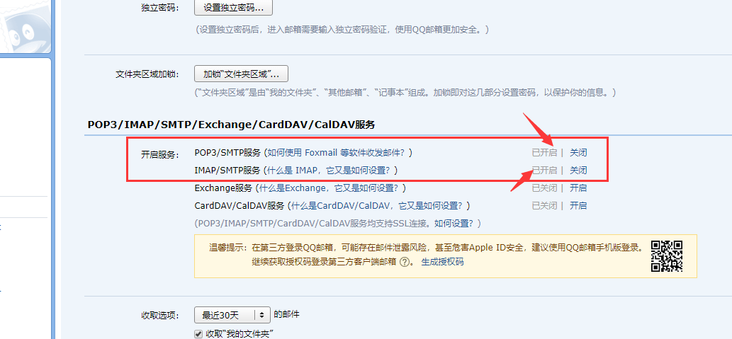 三、找到下圖所示位置,選擇開啟POP3/SMTP和IMAP/SMTP服務