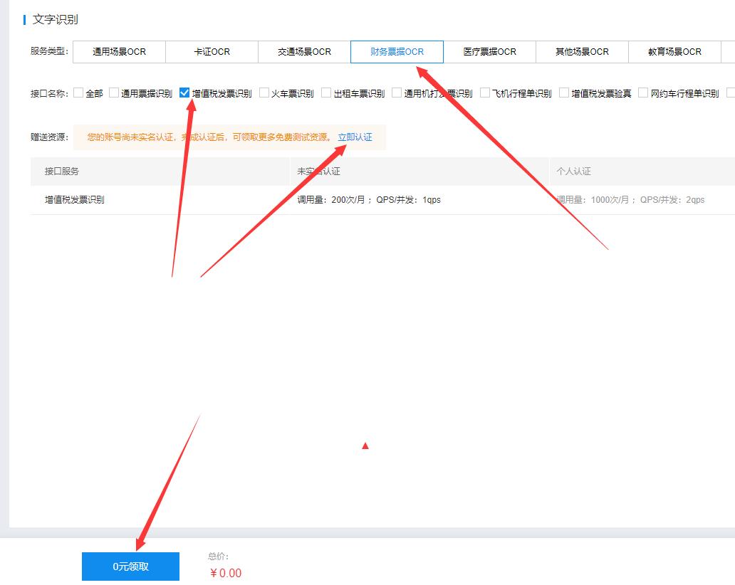 4.新用戶每月有200次的免費(fèi)調(diào)用次數(shù),所以先去領(lǐng)取一下,如果是實(shí)名認(rèn)證了,免費(fèi)次數(shù)可以達(dá)到 1000次/月。