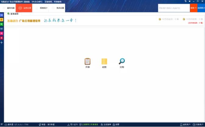 飛揚動力廣告公司管理軟件基礎版適合小型廣告門店使用,具備業務開單、客戶管理、材料管理、報表統計、業務單打印等功能模塊,能有效幫助企業解決生產銷售過程中各種管理難題。