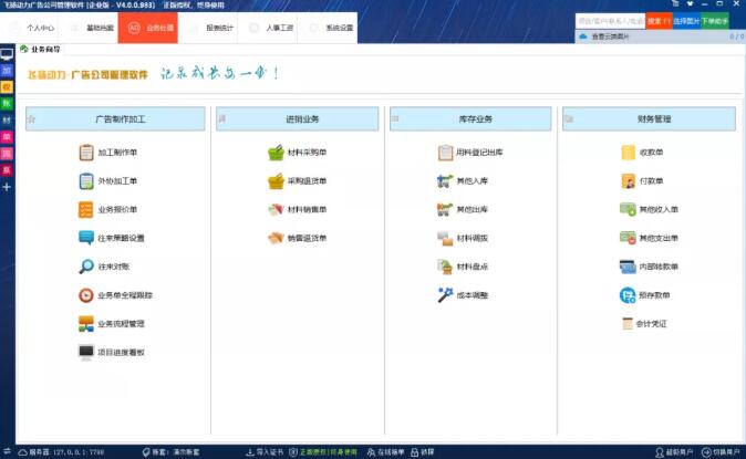 飛揚動力廣告公司管理軟件企業版集業務開單、外協加工管理、人事工資管理、業務流程管理、客戶管理、材料管理、往來策略(不同的客戶不同的價格)、業務單打印等多種管理功能為一體,適合中大型、連鎖型、集團型廣告制作企業。軟件通過將現代化企業管理理念同先進技術架構相結合,打造一體化數字管理體系,幫助廣告企業提升工作效率,實現數字化運營,讓企業管理更加高效、便捷。軟件能規范業務訂單,減少錯單重噴降低材料消耗,提高生產效率,及時統計分析、財務盈虧狀況,是廣告制作公司提升核心競爭力的必備“武器”!