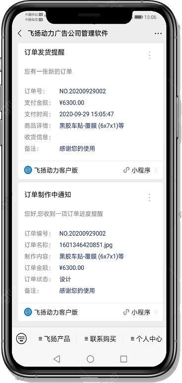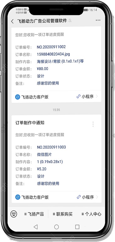 廣告公司開(kāi)單后,消費(fèi)者可以通過(guò)公眾號(hào)實(shí)時(shí)接收到訂單信息,了解自己訂單情況,提高客戶體驗(yàn)。